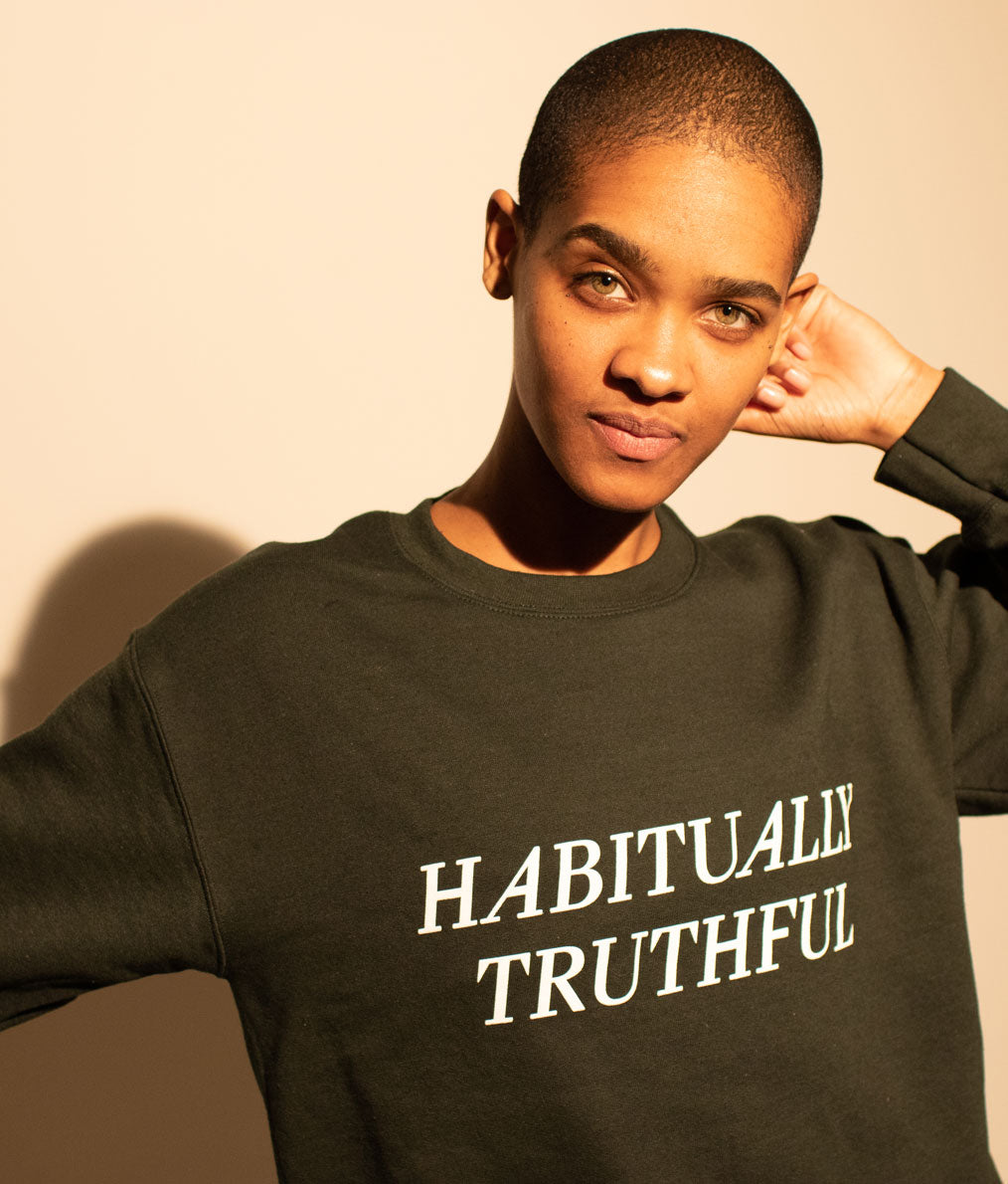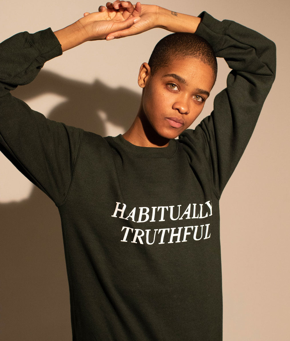 Green cotton crewneck pullover with ‘Habitually Truthful’ cream lettering. Veracity means a commitment to the truth.