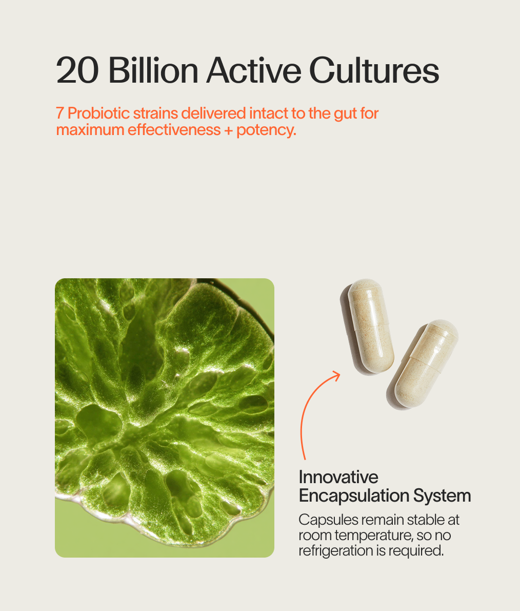 • An innovative encapsulation system keeps the capsules stable at room temperature – no refrigeration needed – while also precisely delivering the strains intact to the gut for maximum potency.