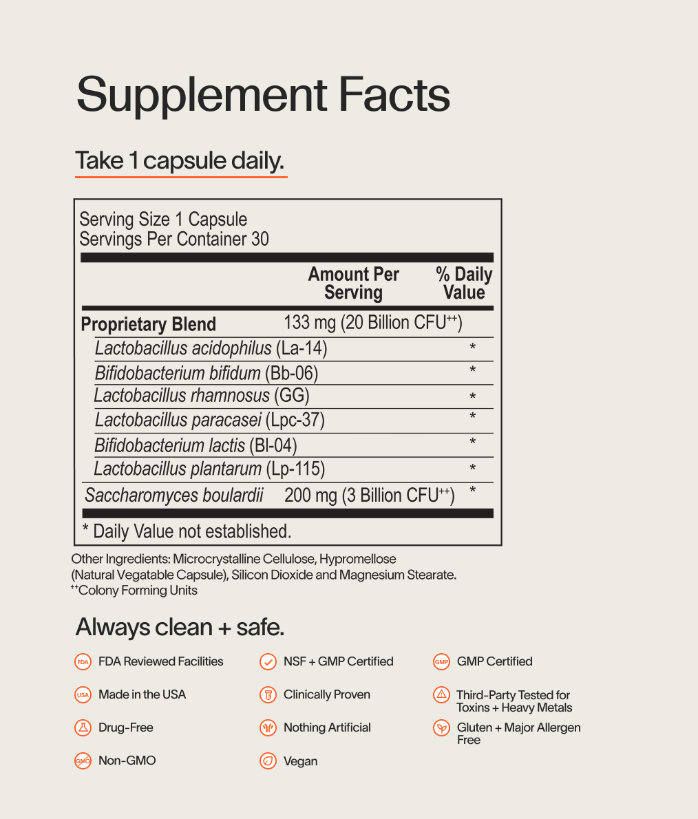 Lactobacillus acidophilus (La-14), Bifidobacterium bifidum (Bb-02), Lactobacillus rhamnosus (GG), Bifidobacterium lactis (BI-04), Lactobacillus plantarum (Lp-115), Lactobacillus paracasei (UALpc-04TM), Saccharomyces boulardii, Microcrystalline Cellulose, Hypromellose (Natural Vegetable Capsule), Silicon Dioxide, Magnesium Stearate
