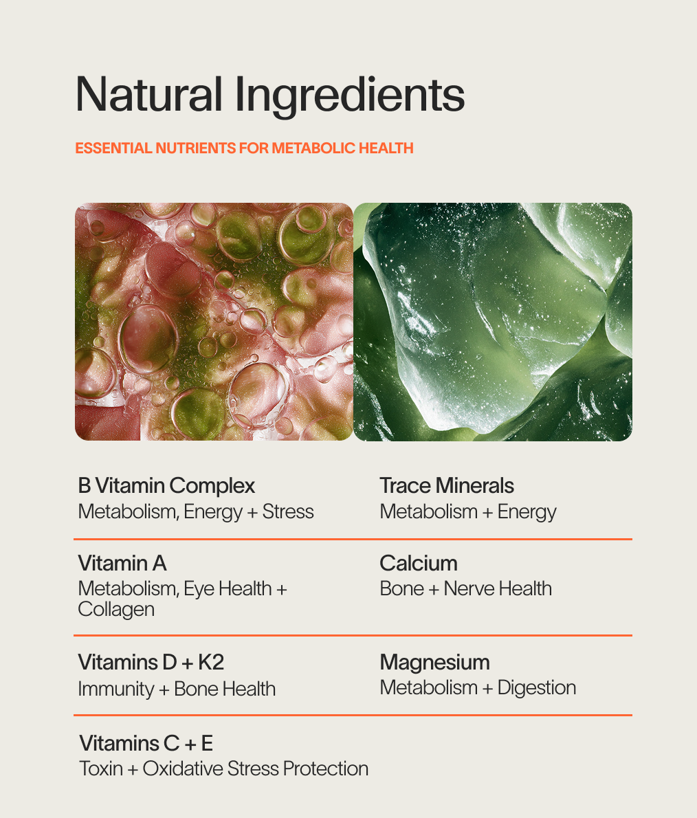 • Metabolic Multivitamin: Vitamin B Complex, along with vitamins A, D, K2, C, and E that provide essential nutrients for hormone production and balance.