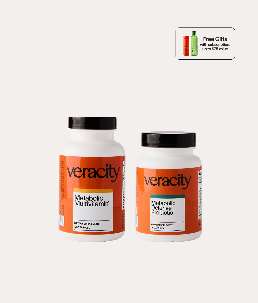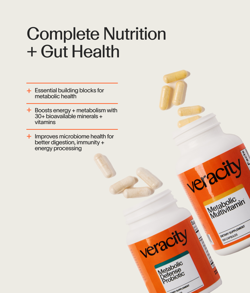 Together the Metabolic Multivitamin and Metabolic Defense Probiotic set the foundation for optimal metabolic function. The multivitamin delivers bioavailable minerals, vitamins, and micronutrients that support energy production, enhance cellular metabolism, and help maintain balanced blood sugar and nutrient levels. The probiotic replenishes the gut with diverse, beneficial bacteria to support digestion, reduce bloating, and promote a healthy gut lining, key for nutrient absorption and overall metabolic health.