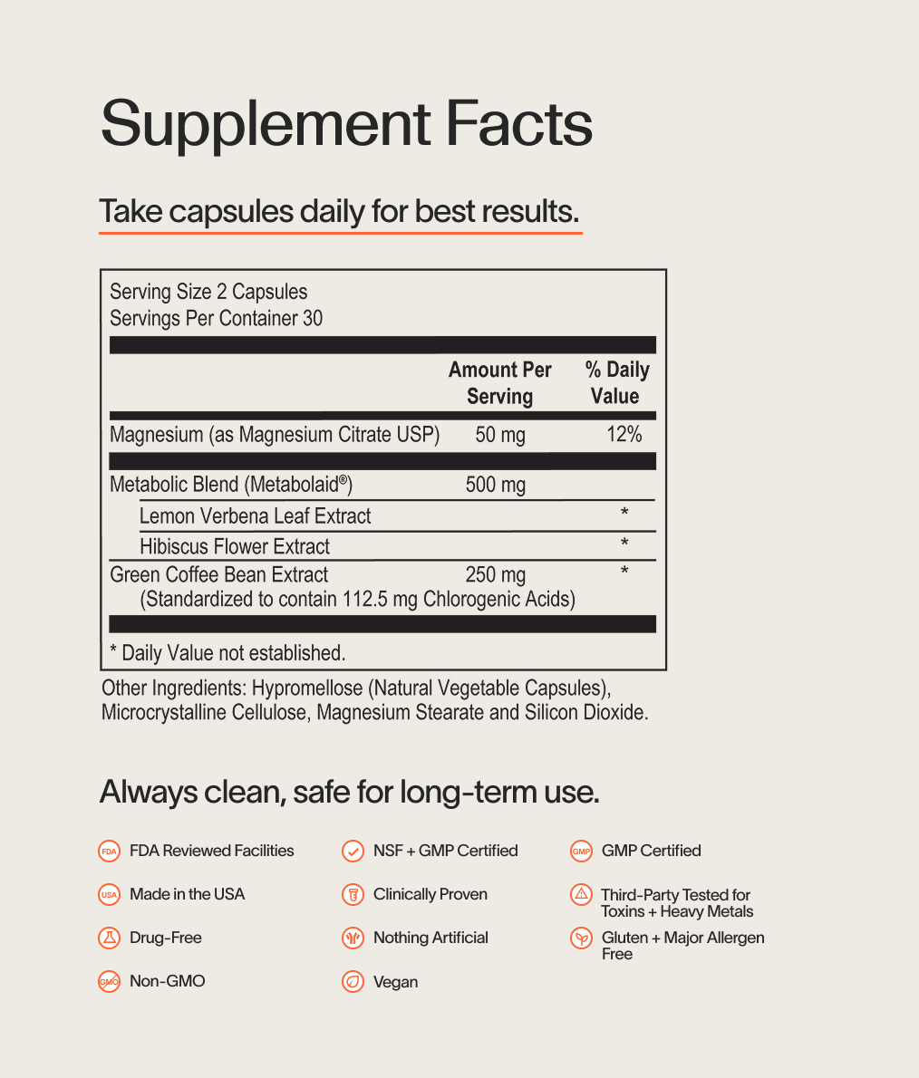 Magnesium (as Magnesium Citrate USP), Metabolic Blend (Metabolaid®), Green Coffee Bean Extract, Hypromellose (Natural Vegetable Capsules),